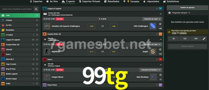 O 99tg oferece uma grande seleção de opções de apostas em e-sports com probabilidades competitivas
